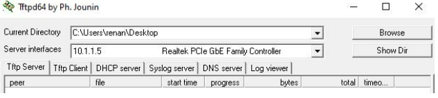 Utilize o o software Tftpd64 para transferência, especificando o diretório e a interface do servidor